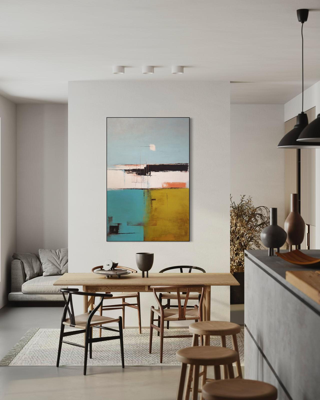 Ten oryginalny, nowoczesny obraz abstrakcyjny jest częścią intrygującej kolekcji, która bada granice współczesnej sztuki i abstrakcyjnych pejzaży. Wykonany profesjonalnymi farbami akrylowymi na wysokiej jakości płótnie, każdy obraz jest unikalną ekspresją żywych kolorów i emocjonalnej głębi.
